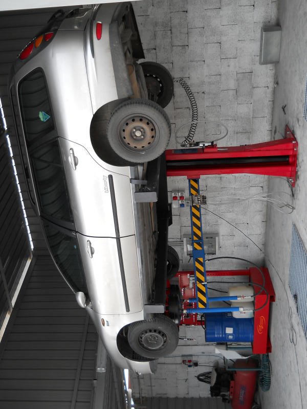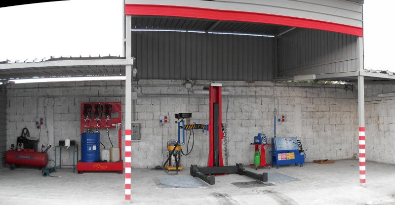Impianto installato in puglia composto da ponte sollevatore elettroidraulico monocolonna portata 3 ton con braccio snodato con doppio imbuto per la raccolta a caduta dell'olio motore e cambio; parete aspirante pneumatica per antigelo,lavavetri e liquido freni;bucaserbatoi carburante pneumatico portatile; tagliavetri; disattivatore air bag;recupero e riciclo gas aria condizionata e impianto per la messa in sicurezza dei serbatoi di GPL e metano